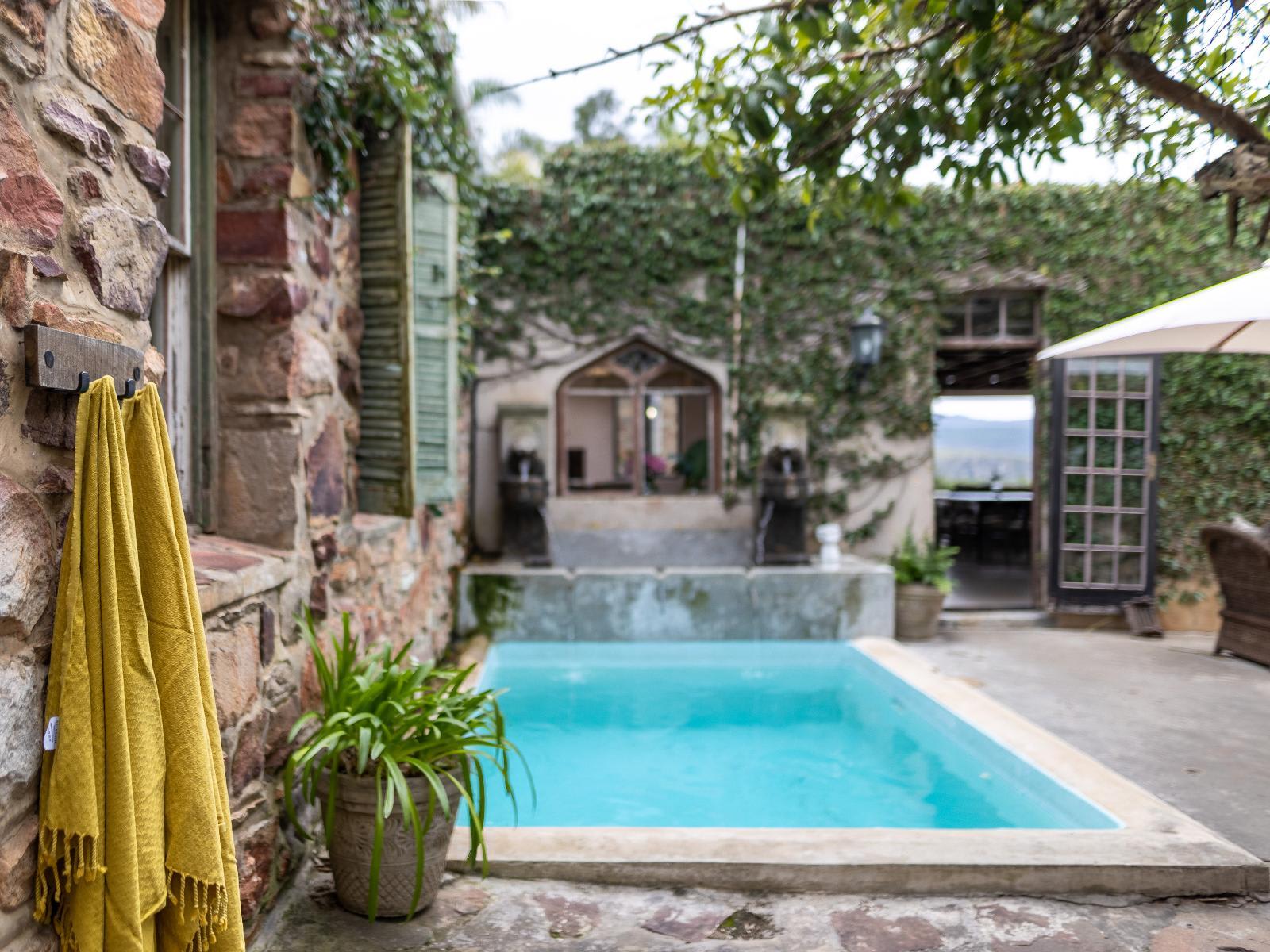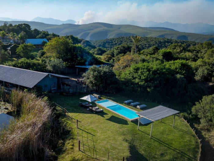 Belle Balance Bush Hideout has a lovely plunge pool, big outdoor swimming pool with lounges, comfortable sofas and chairs on the veranda, an attractive lounge and beautiful farmhouse dining room, there are fireplaces everywhere to ensure a cozy environment where guests can sink into a plush chair and relax.